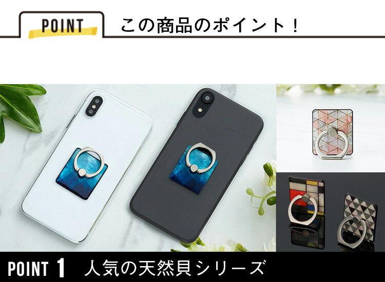 おすすめアイテム iPhone8天然貝ケース Mondrian 4800円(税抜) 天然貝特有の光沢が美しいケース 4390円(税抜) 360度回転可能リング 1190円(税抜) 耐衝撃・耐振動設計 1780円(税抜) 人気の天然貝シリーズ 落下防止!バンカーリング ◆ 人気の天然貝シリーズ 天然貝を使用したおしゃれなデザインのスマートリングです。